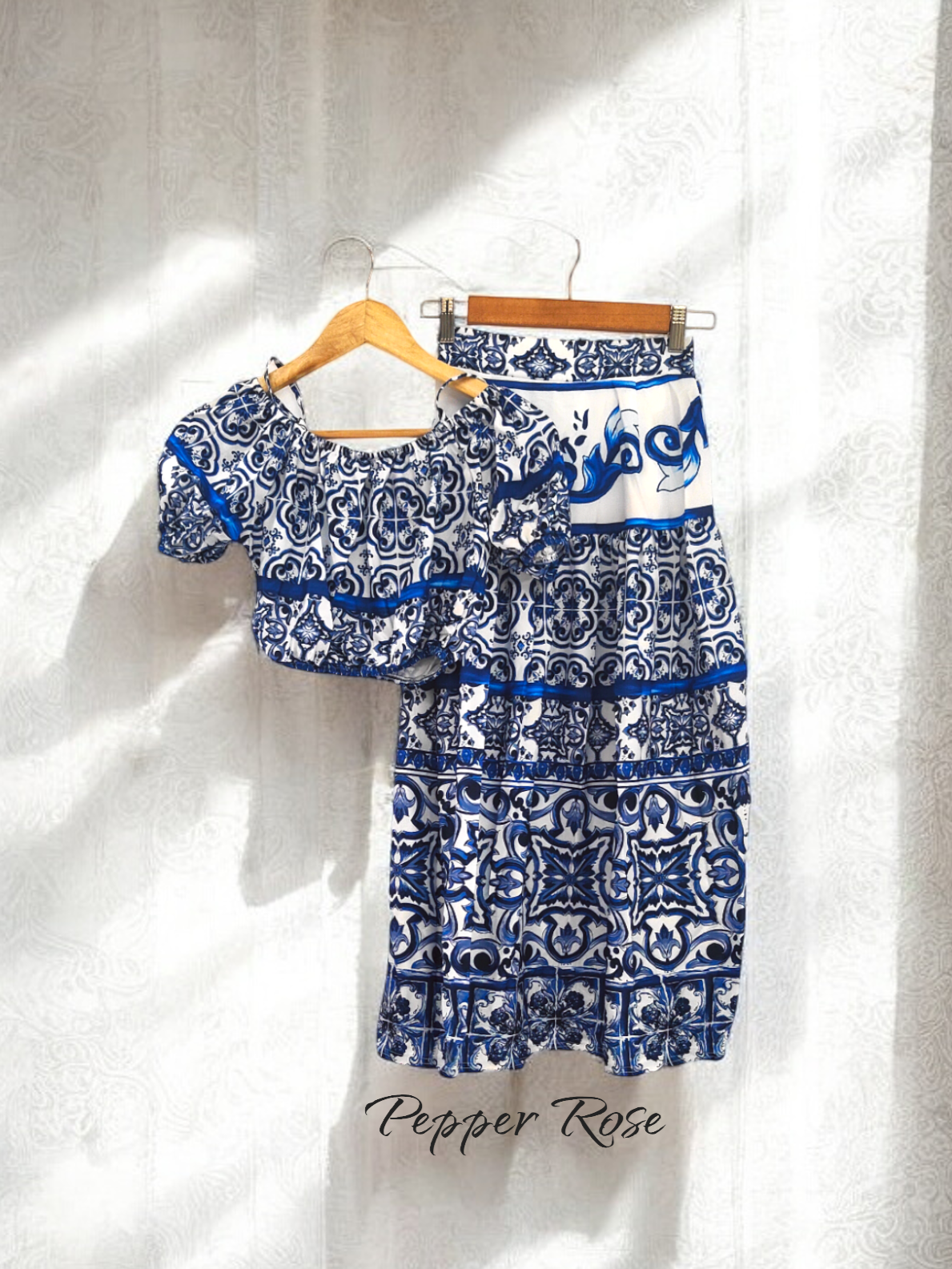 Amyra Floral Co-Ord Set with Crop Top & Skirt - Blue/White