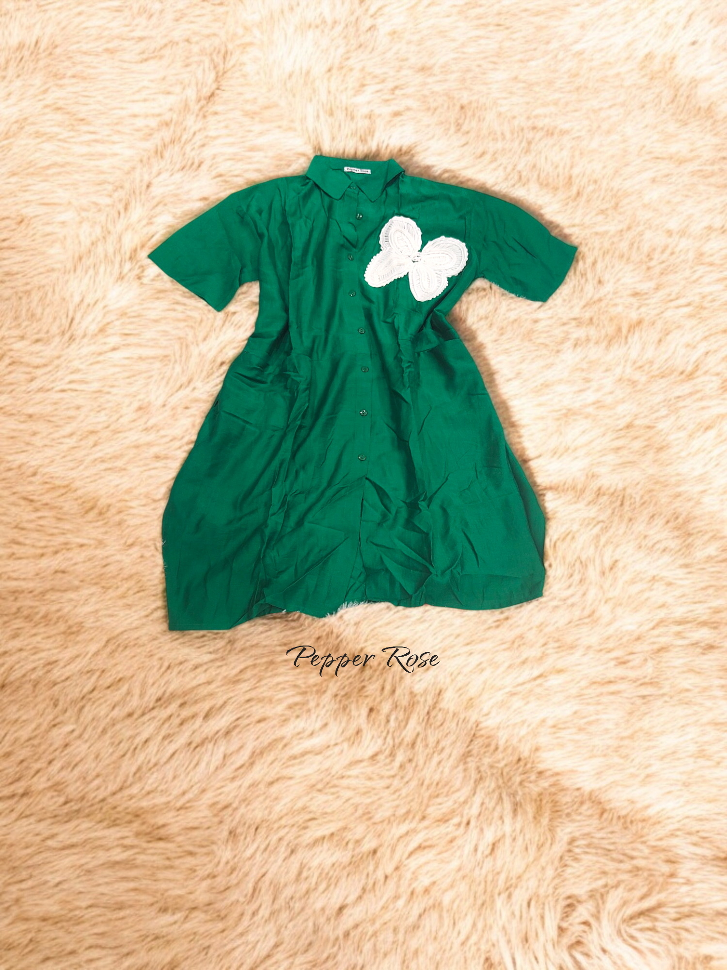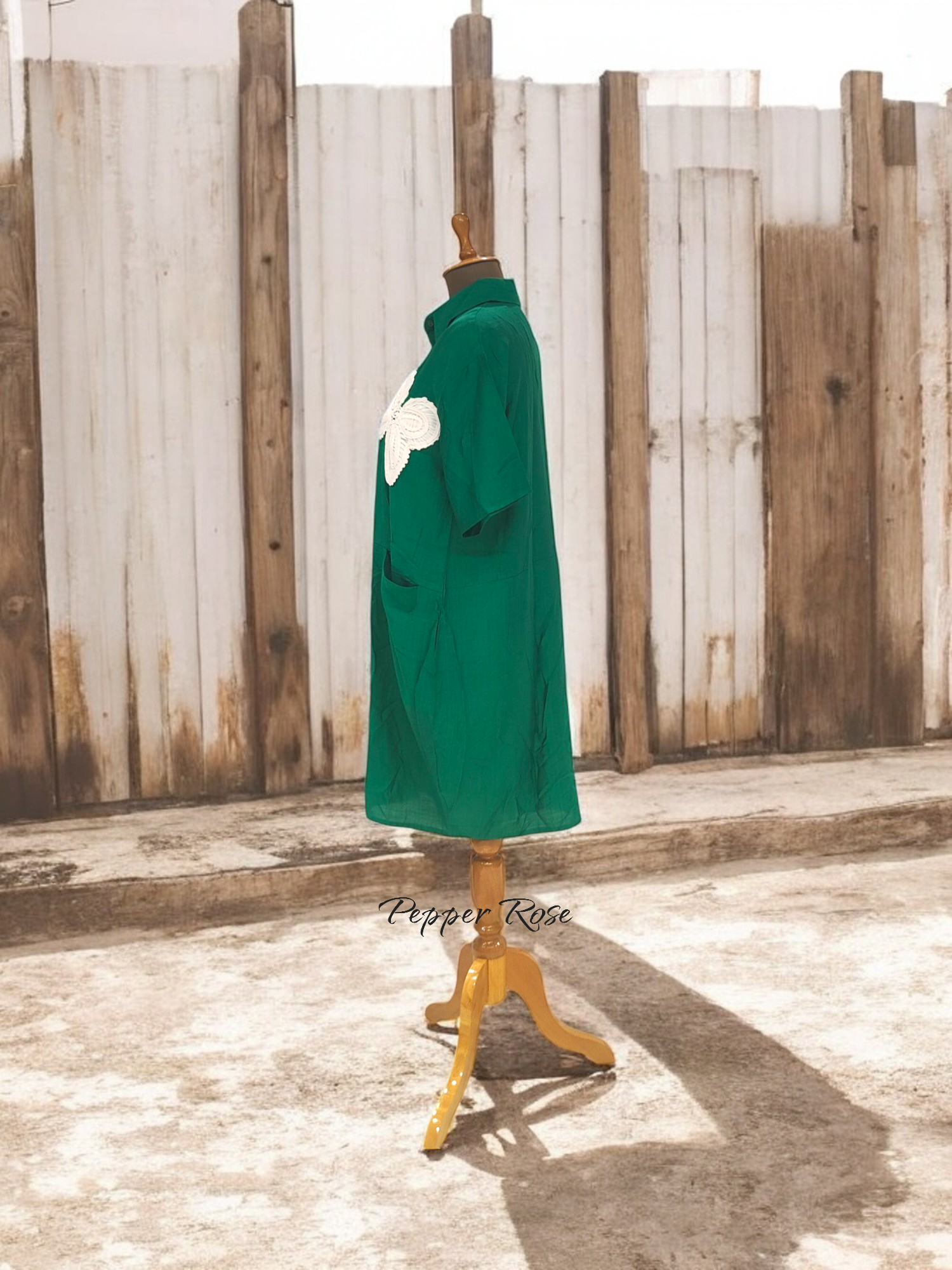 Anaisa cotton poly viscose slub loose fit buttoned cum dress with black decorative lace.