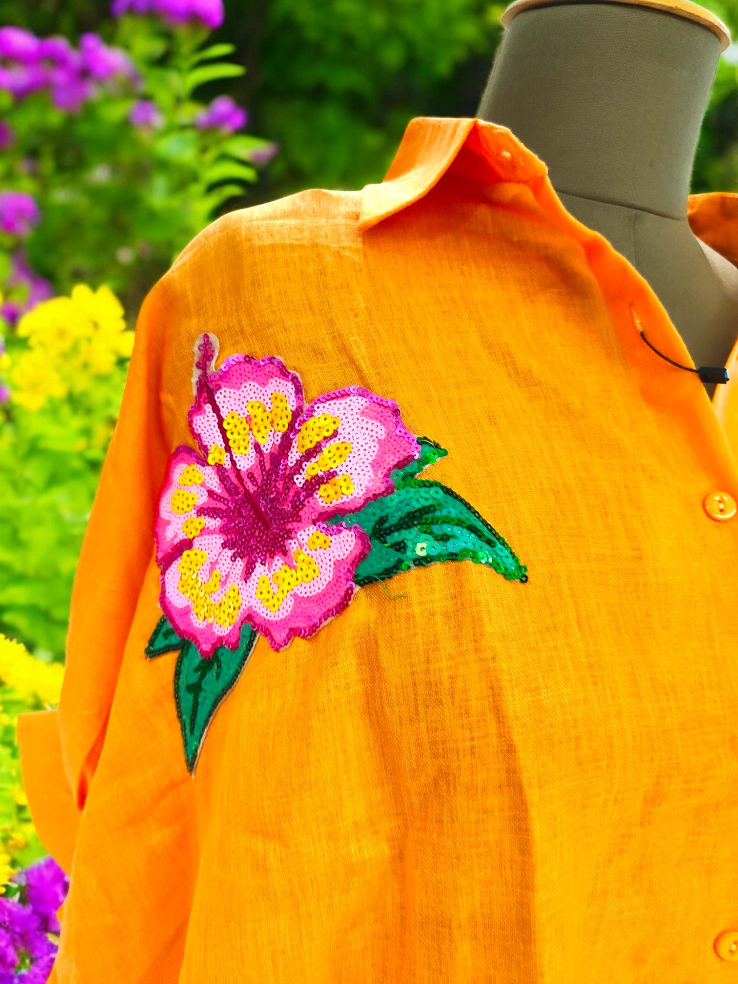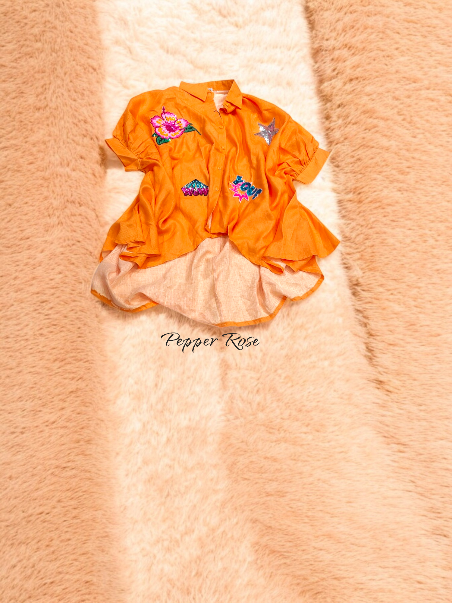 Aria Orange cotton rayon fabric oversized shirt with 4 different design patch.