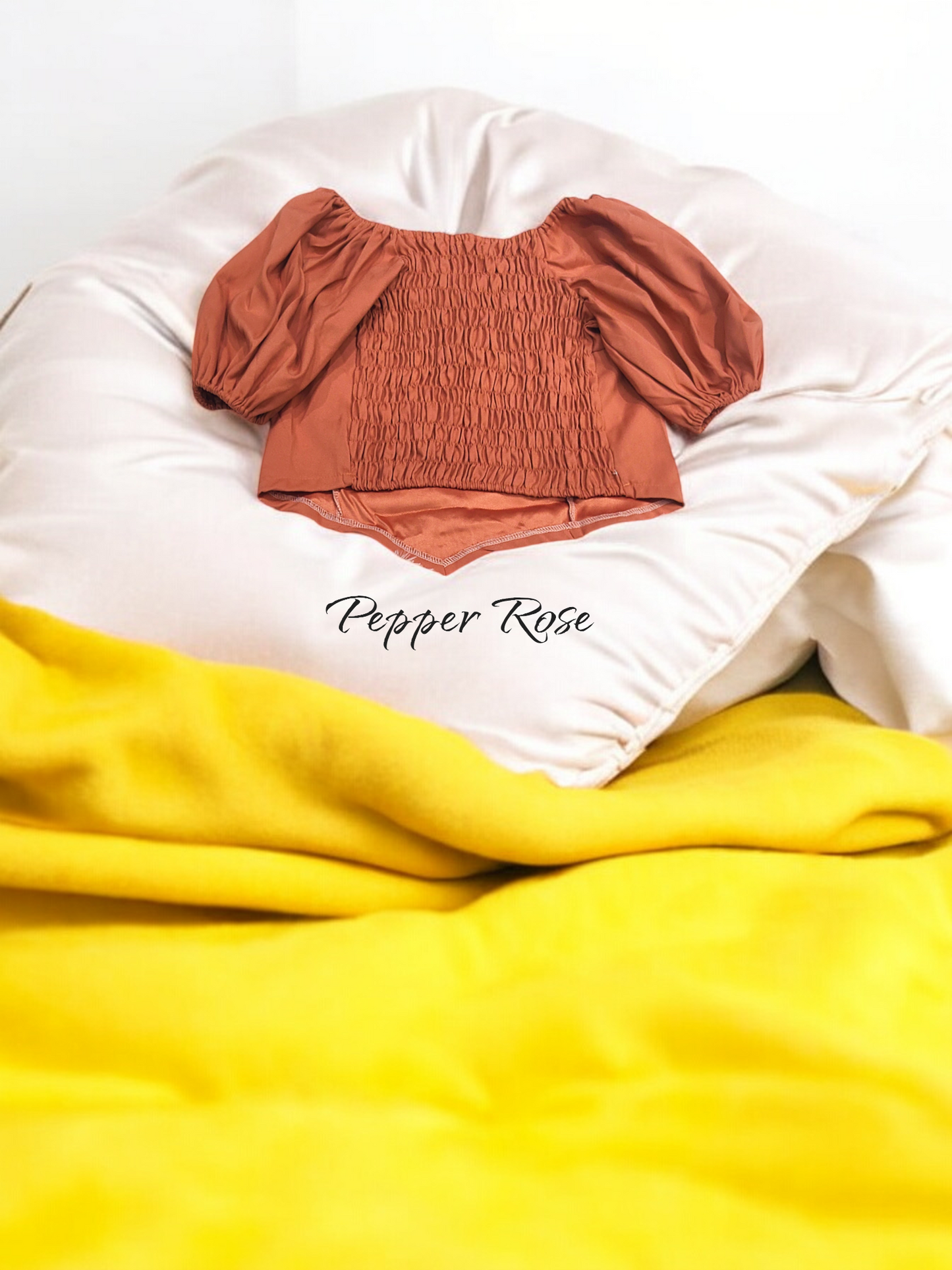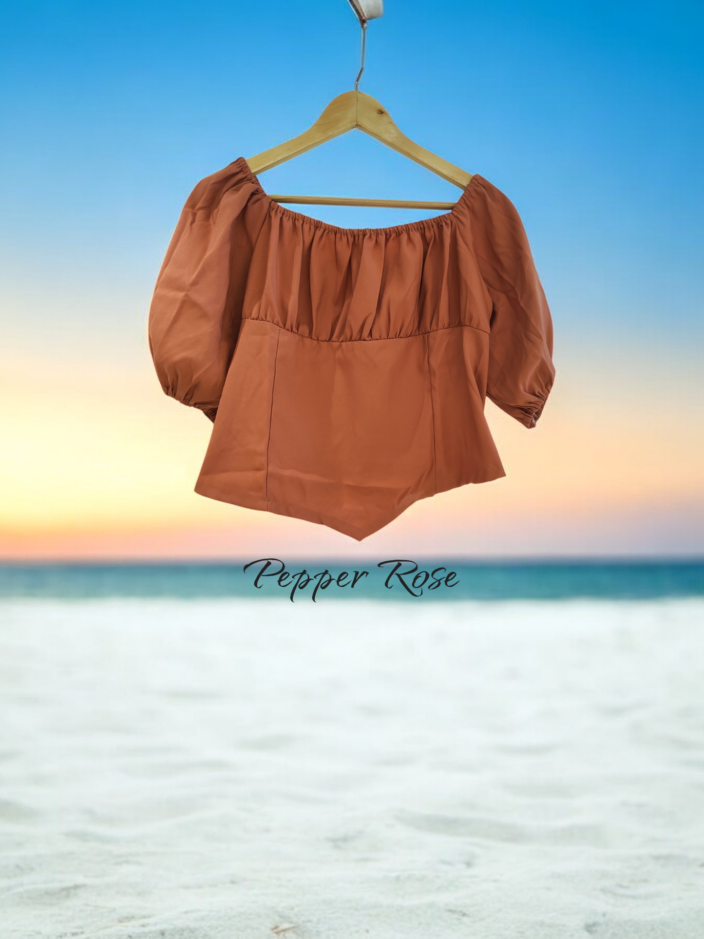 Brown Ava hem top with puff sleeves in grain texture(combination of chiffon & satin fabric). Bold beautiful and ready to shine - Our tops are made for moments that matter.