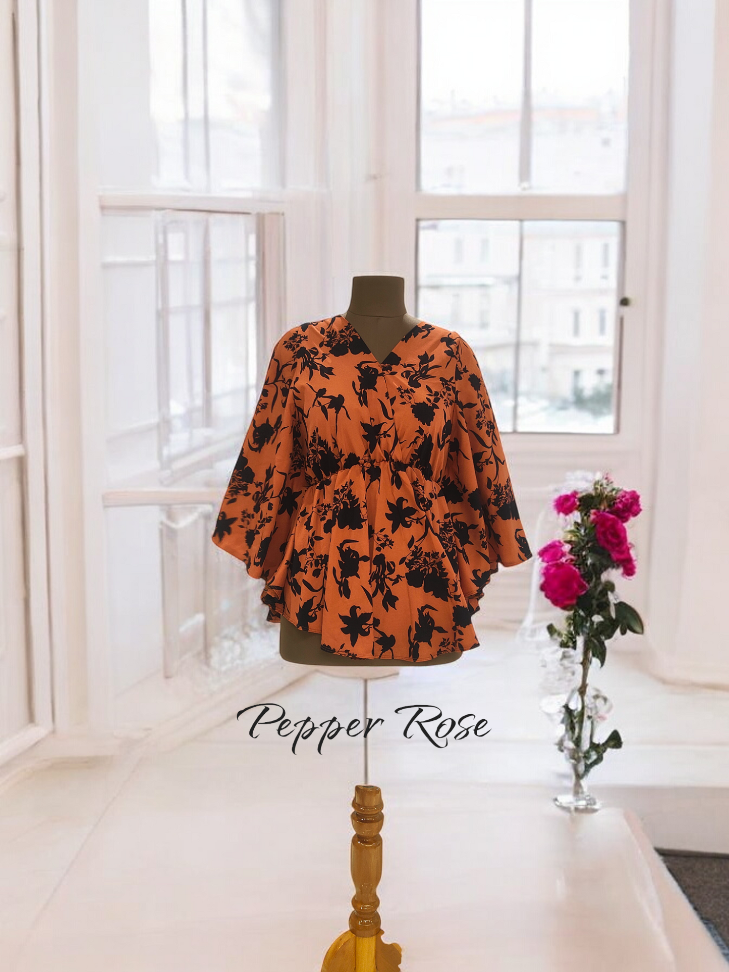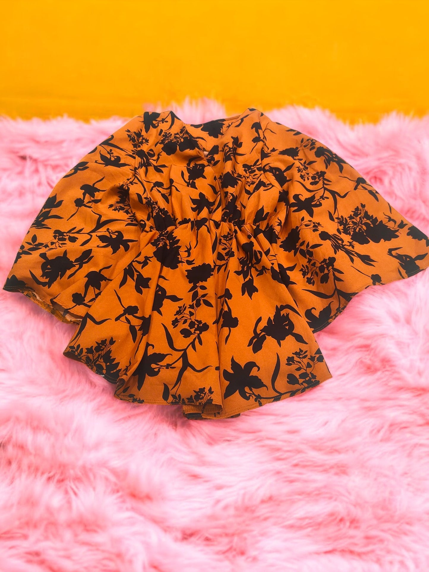 Blossom Bliss Kaftan top in floral delight digital print in Orange/Black color. Your perfect blend of comfort and glam for any occasion.