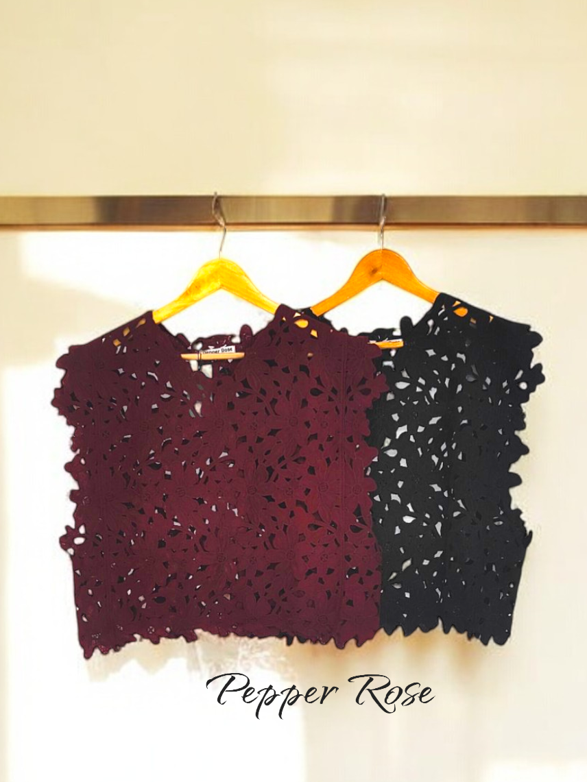 Charlotte lace top in Guipure Lace made up of continuous floral motifs