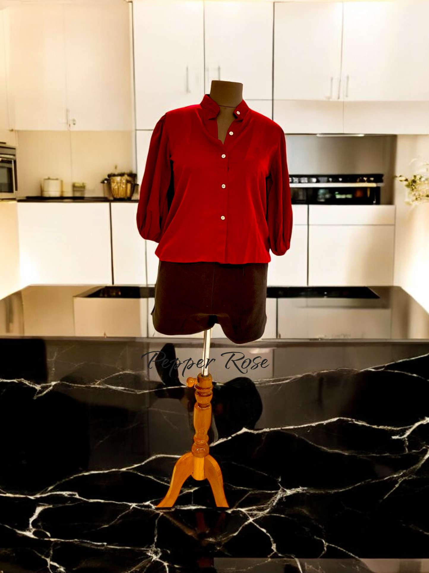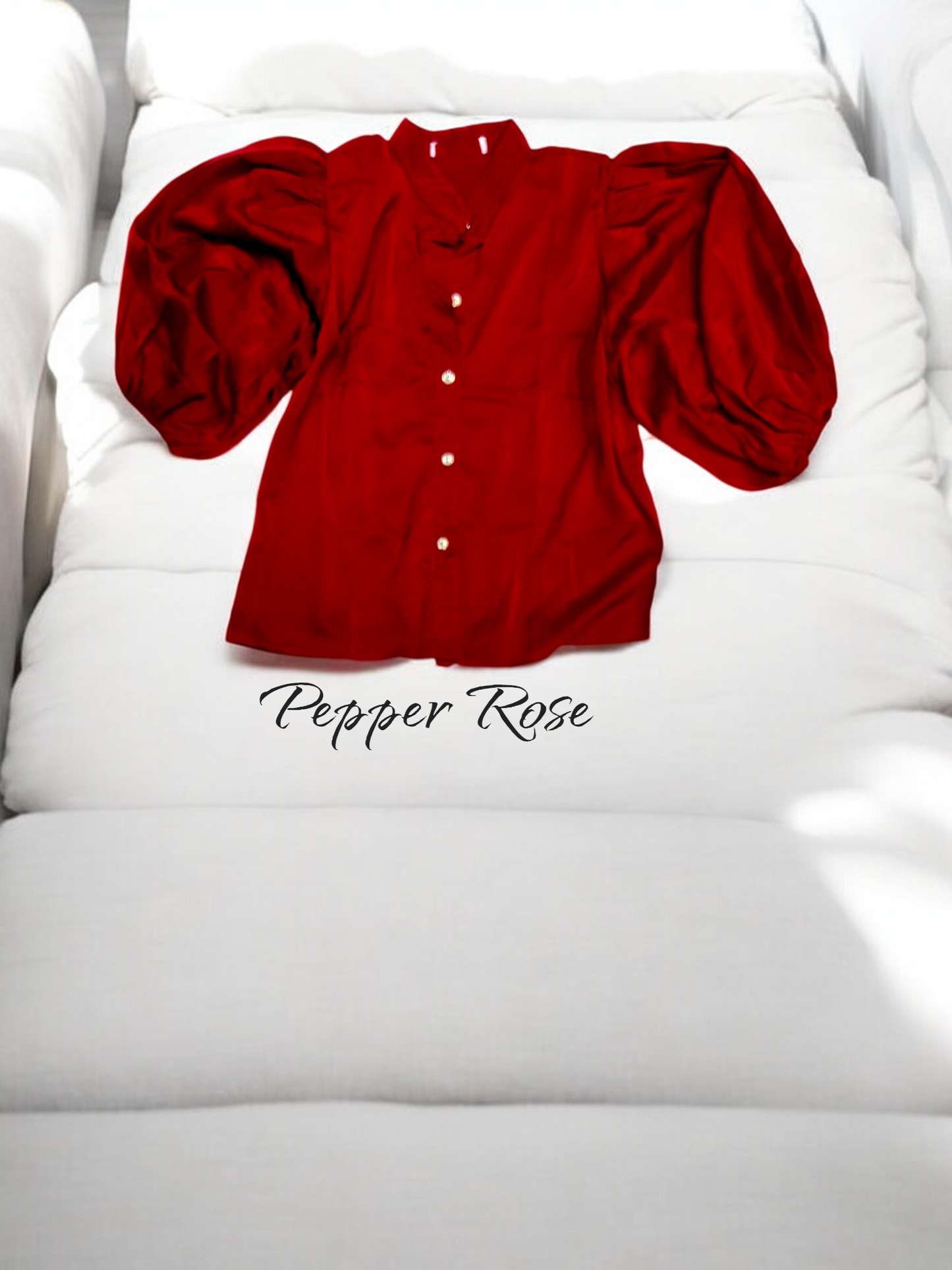Red Jova shirt with long puff sleeves in satin fabric. Bold beautiful and ready to shine - Our shirts are made for moments that matter.