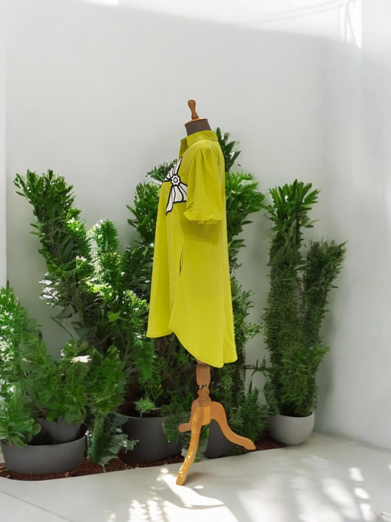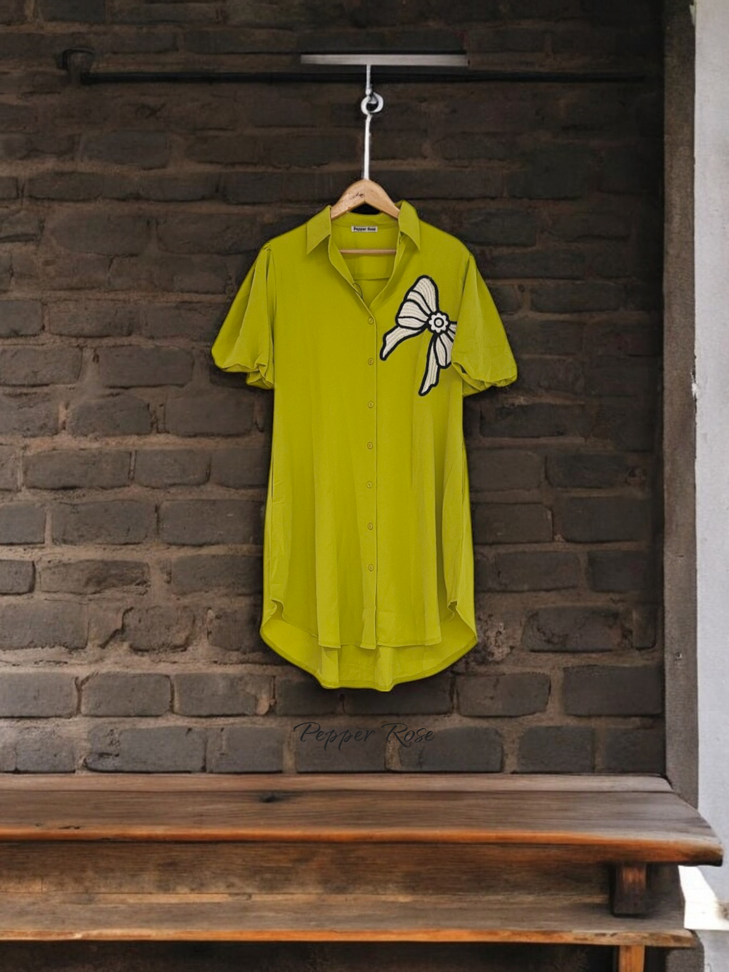 Lia Fluorescent Green satin buttoned shirt cum dress with white decorative boy lace at the left side.