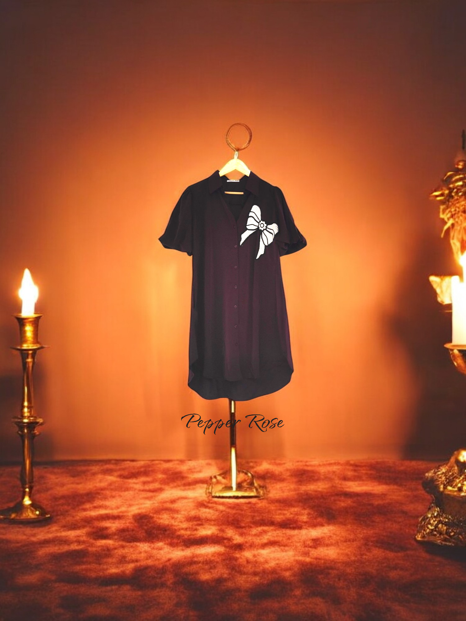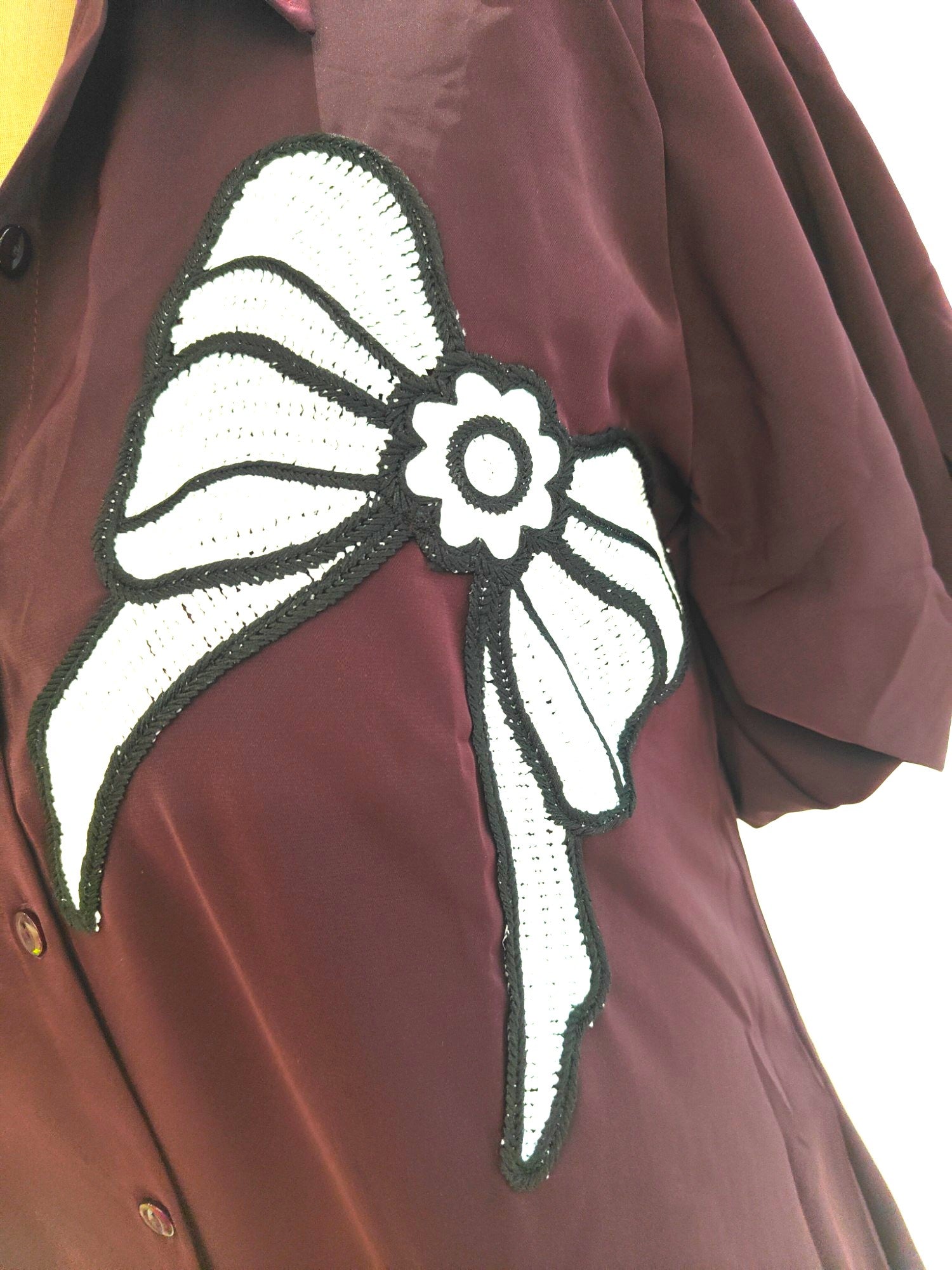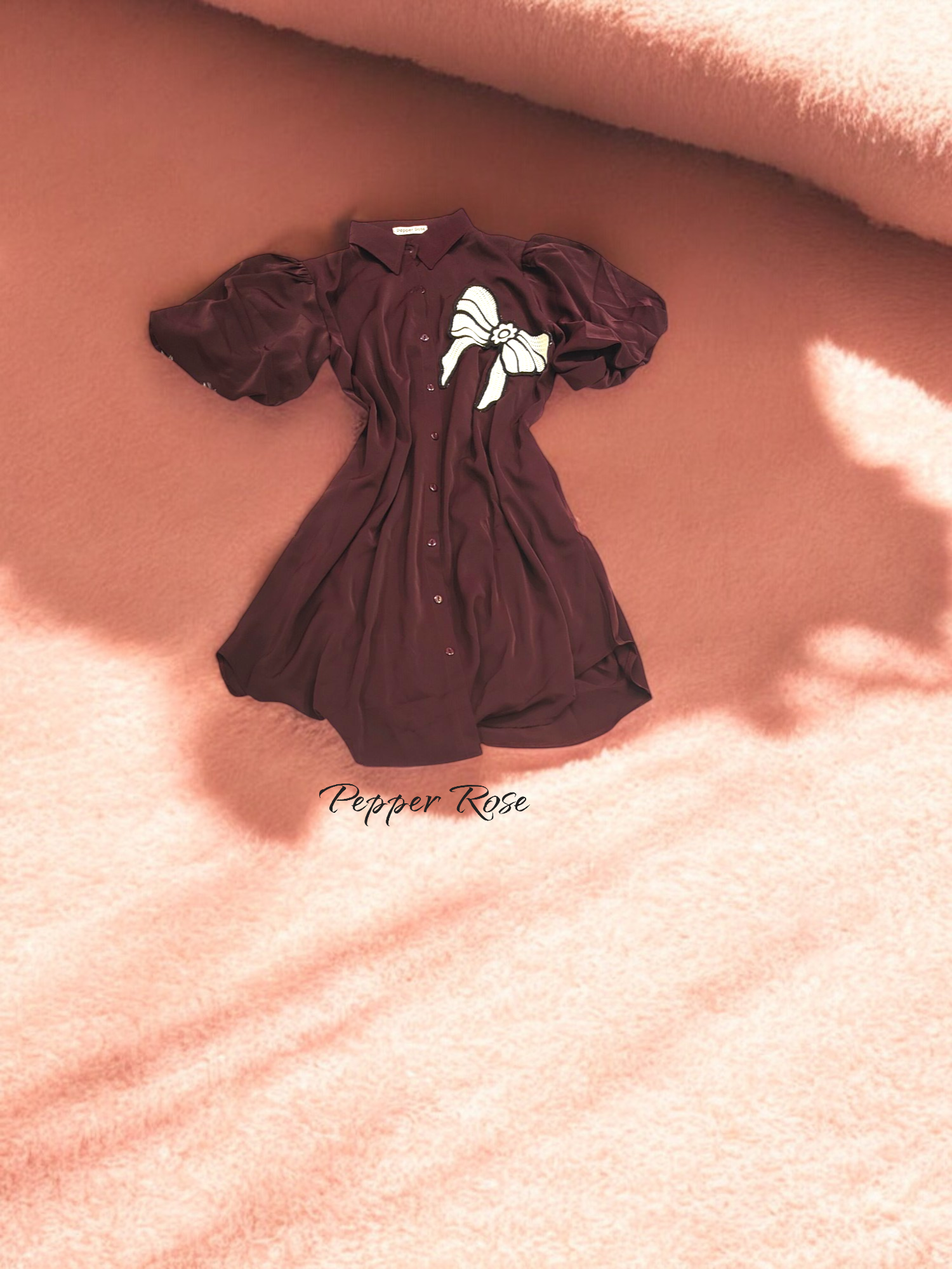 Lia Wine color satin buttoned shirt cum dress with white decorative bow lace at the left side.