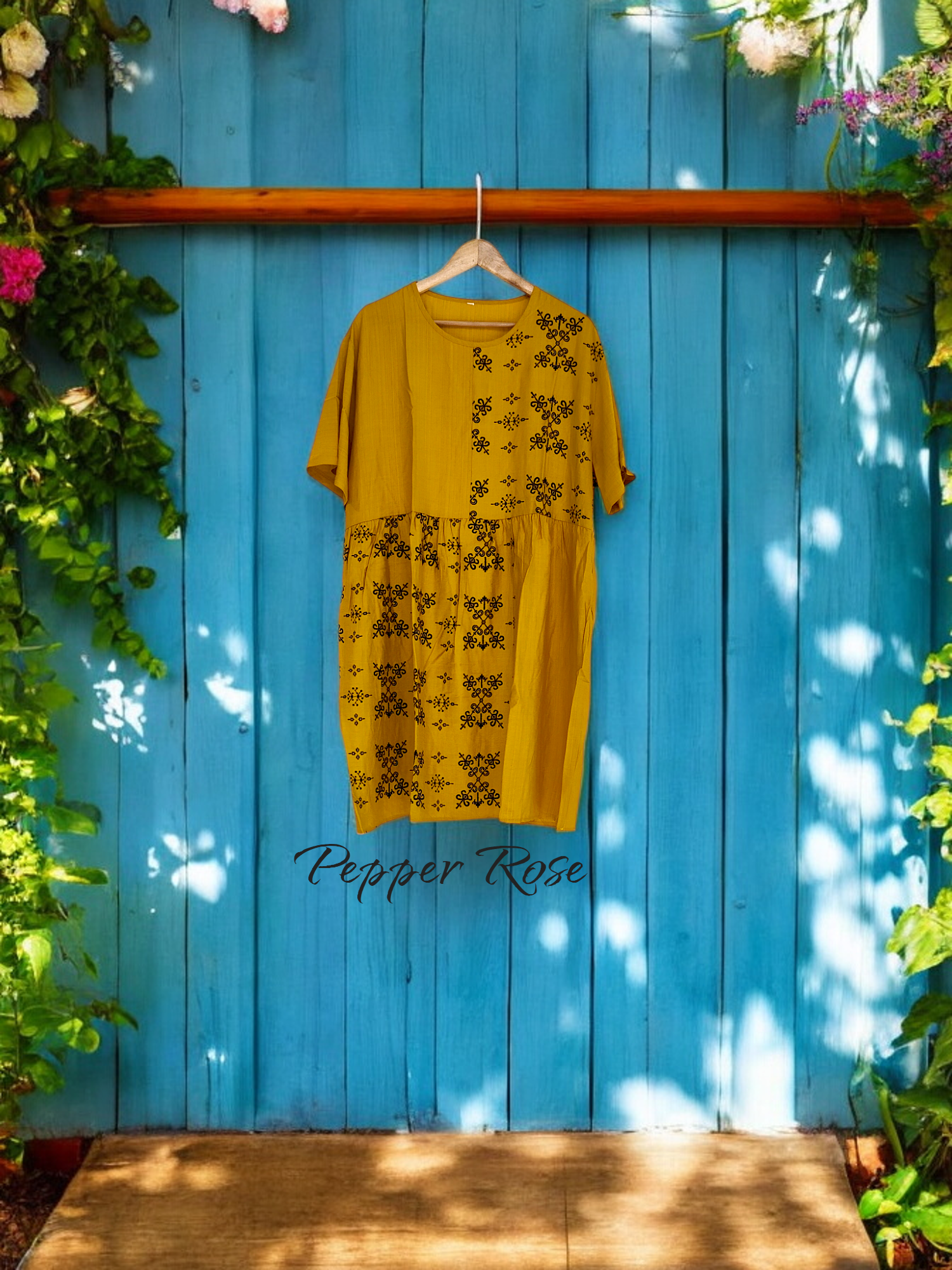 Yellow color Rivaya ethnic motifs printed top cum dress in mulmul cotton fabric. Your perfect blend of comfort and glam for any occasion.