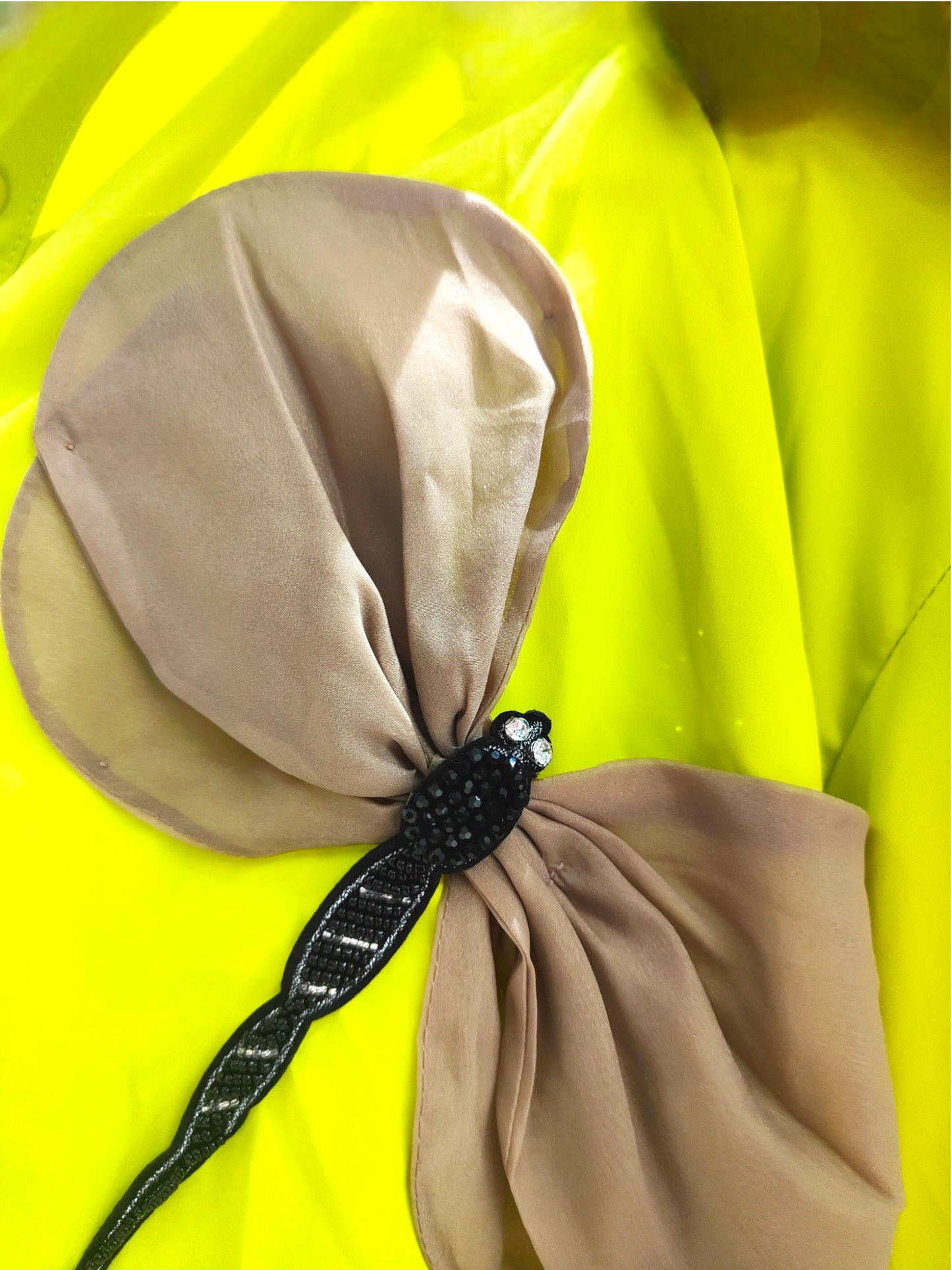 Ziya satin loose fit buttoned shirt cum dress with decorative dragon fly patch at the left.