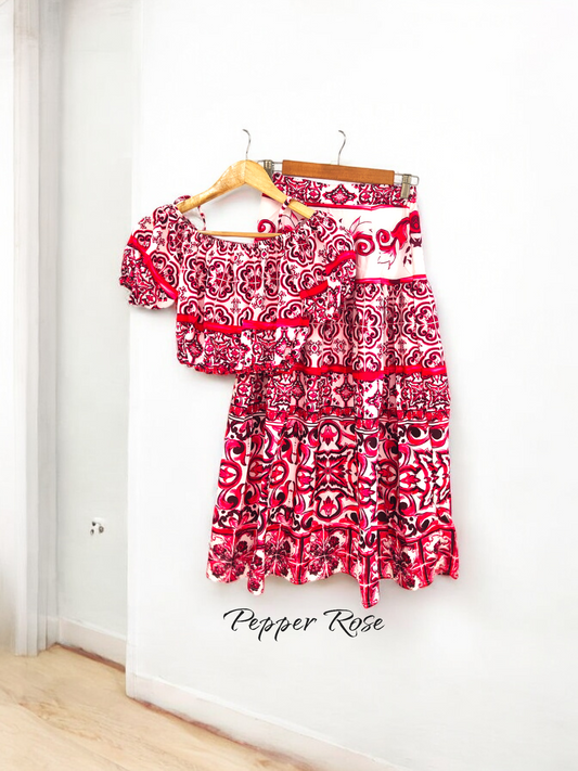 Amyra Floral Co-Ord Set with Crop Top & Skirt - Pink/White