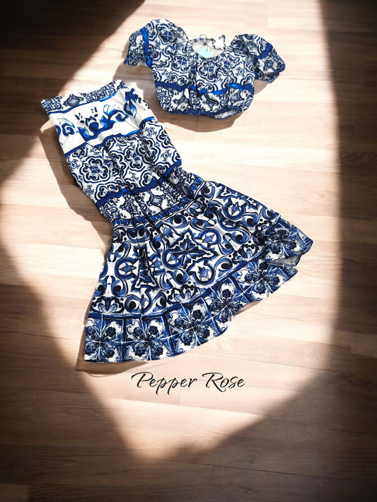 Amyra Floral Co-Ord Set with Crop Top & Skirt - Blue/White