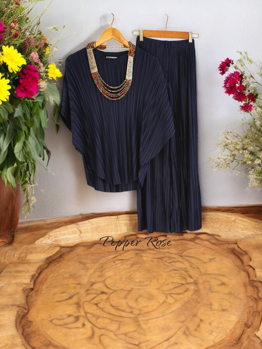 Alice Pleated Plain Co-Ord Set - Navy Blue